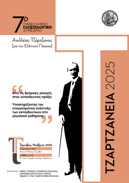 7ου Πανελλήνιου Γλωσσολογικού Συνεδρίου «ΤΖΑΡΤΖΑΝΕΙΑ 2025», το οποίο πραγματοποιείται την Παρασκευή 28 Νοεμβρίου 2025 στο Δημοτικό Θέατρο Τυρνάβου & το Σάββατο 29 Νοεμβρίου 2025 1ο Γυμνάσιο Τυρνάβου «Αχιλλέας Τζάρτζανος»,με θέμα: «Από τις θεσμικές αλλαγές στην εκπαιδευτική πράξη: Υποστηρίζοντας την επαγγελματική ανάπτυξη των εκπαιδευτικών στα γλωσσικά μαθήματα».