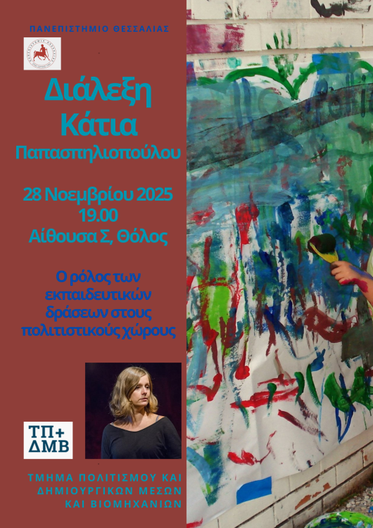 Το Τμήμα Πολιτισμού και Δημιουργικών Μέσων και Βιομηχανιών του Πανεπιστημίου Θεσσαλίας σας προσκαλεί στη διάλεξη / ανοιχτή συζήτηση με την Κάτια Παπασπηλιοπούλου, με θέμα: «Ο ρόλος των εκπαιδευτικών δράσεων στους πολιτιστικούς χώρους».