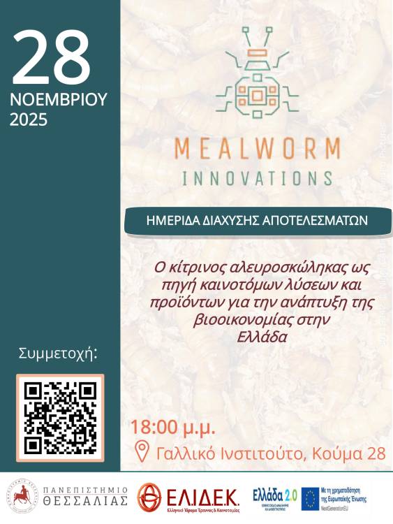 Ημερίδα Διάχυσης Αποτελεσμάτων του ερευνητικού προγράμματος “Mealworm Innovations: O κίτρινος αλευροσκώληκας ως πηγή καινοτόμων λύσεων και προϊόντων για την ανάπτυξη της βιοοικονομίας στην Ελλάδα”. Η εκδήλωση θα πραγματοποιηθεί την Τετάρτη 28 Νοεμβρίου στις 18.00 στο Γαλλικό Ινστιτούτο Λάρισας (Κούμα 28).