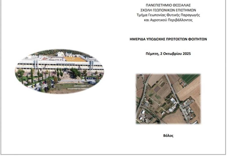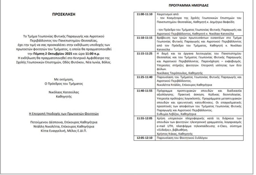 Το Τμήμα Γεωπονίας Φυτικής Παραγωγής και Αγροτικού Περιβάλλοντος του Πανεπιστημίου Θεσσαλίας, έχει την τιμή να σας προσκαλεί στην εκδήλωση υποδοχής των πρωτοετών φοιτητών του Τμήματος, η οποία θα πραγματοποιηθεί την Πέμπτη, 2 Οκτωβρίου 2025 και ώρα 11:00 π.μ. στο κεντρικό αμφιθέατρο της Σχολής Γεωπονικών Επιστημών, οδός Φυτόκου, Νέα Ιωανία, Βόλος.
